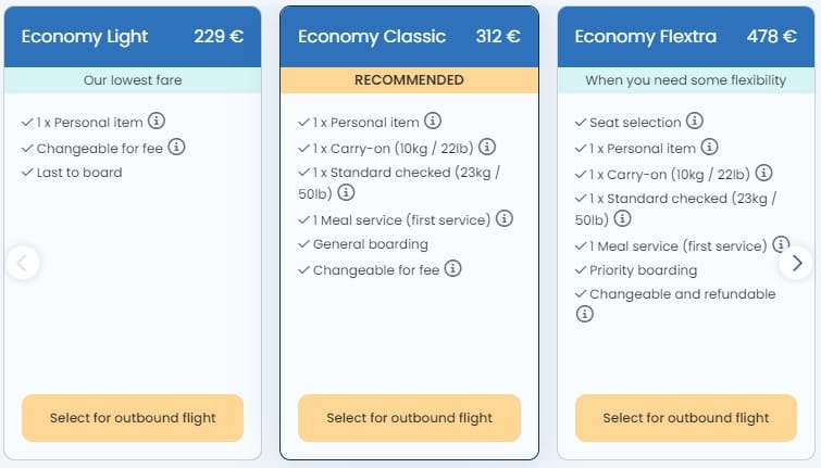 Gelukkig werd er niet gecontroleerd en dus kom ik er mee weg. Speel je liever op safe, of reis je met meer bagage dan ik, dan zijn er verschillende opties. Zoals hieronder afgebeeld? kun je tijdens het boekingsproces kiezen uit verschillende tarieven met bijbehorende voordelen.